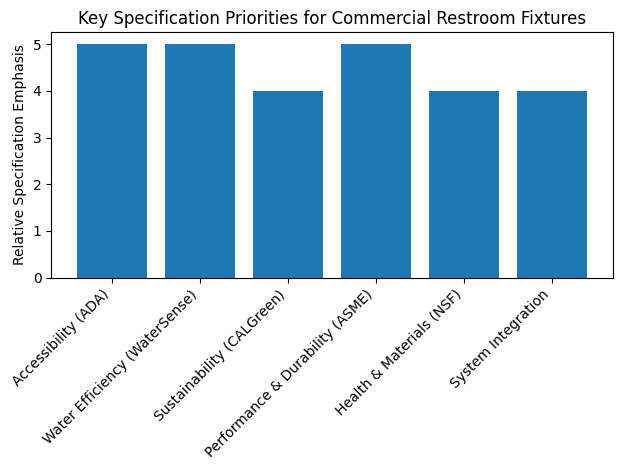 A restroom fixture selection process is strongest when it is documented like a system, not a collection of products. A well built specification sheet pack supports three outcomes: code compliant accessibility, measurable water and energy performance, and maintainable durability under public use. Use the pack to standardize comparisons early, then carry the same data forward into schedules, specs, and submittals so the construction team is installing exactly what was evaluated.