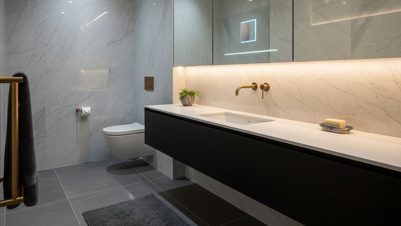 - Prefer PVD brass-tone metallics for primary plumbing hardware