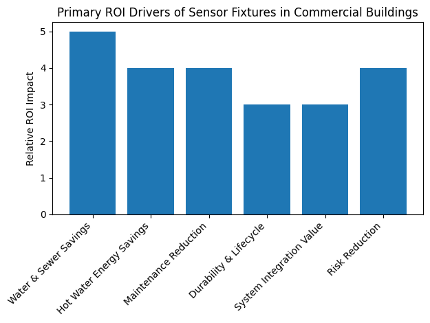 Expected reduction in run time, compared to using manual fixtures Local water and sewer utility rates Estimated hot water fraction and energy cost Difference in the cost of maintenance among manual and sensor fixtures Value of risk reduction from avoided overflows, vandalism, and downtime The financial case is more easily validated and sustained over the life of the building when sensor fixtures are specified as part of an engineered system rather than a cosmetic upgrade.